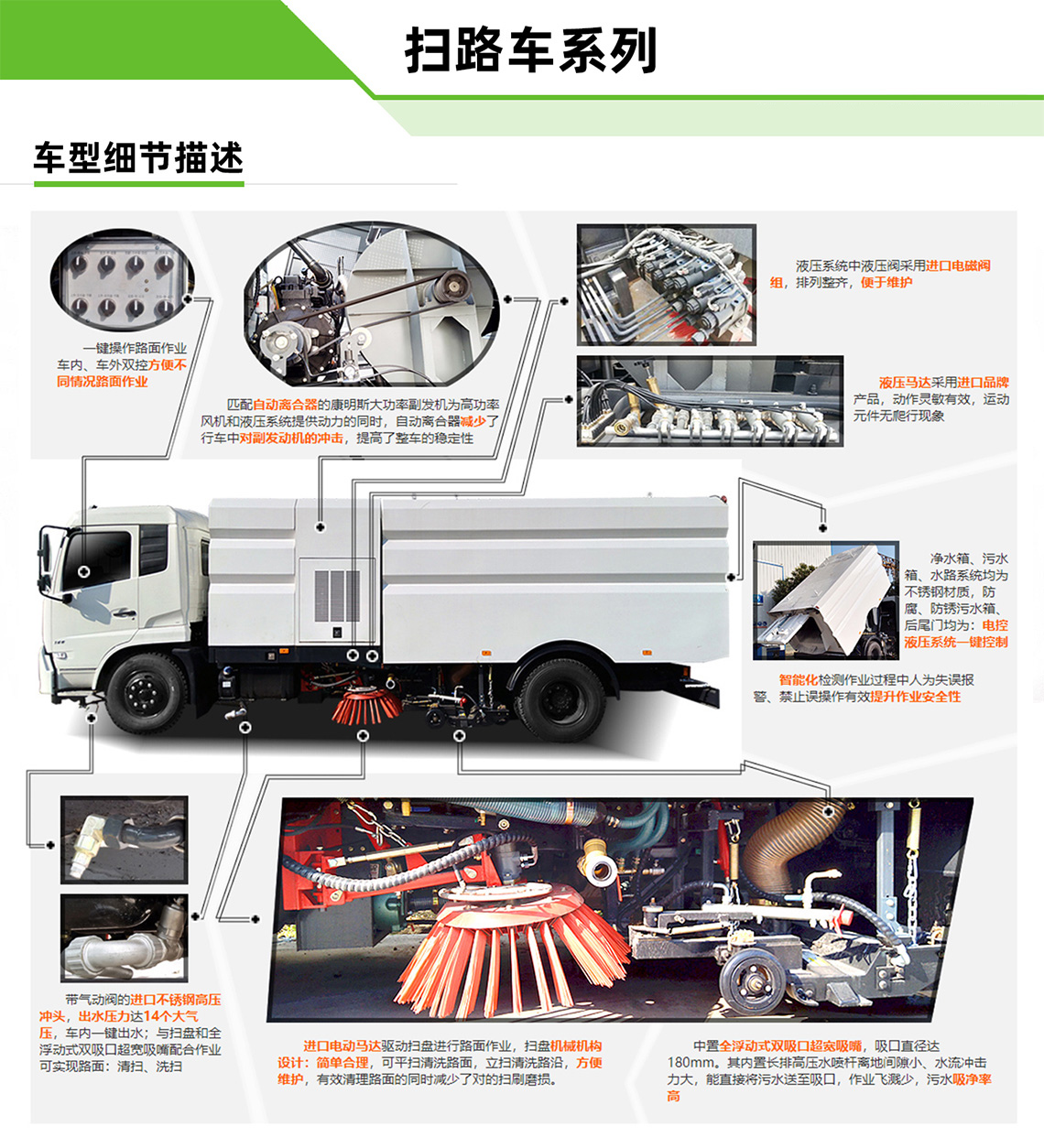 帶掃盤4把,江鈴副發(fā)動機;大力馬達;施耐德控件開關;臺灣電磁閥組;免維護自分離式離合器;免維護風機;不銹鋼水箱;不銹鋼垃圾箱;尾部LED箭頭燈;手動泵應急系統(tǒng);刷臂轉動機構使用高新耐磨工程隔套,免打黃油;精密冷彎無縫液壓油管。